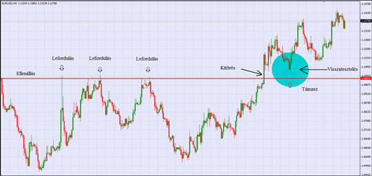 Az alábbi képen láthatjuk, hogy az árfolyam egy jelentős ellenállásba ütközik, szám szerint háromszor teszteli az árfolyam ezt az ellenállást, de mind a háromszor lefordul erről az ellenállásról. Majd negyedszerre sikerül a kitörés, az árfolyam nagy lendülettel áttöri az ellenállást majd következik egy korrekció és kialakul a visszatesztelés. Az ellenállás itt már támaszként működik és nem engedi, hogy az árfolyam ez alá kerüljön és lefordul róla és elindul a kitörés irányába.